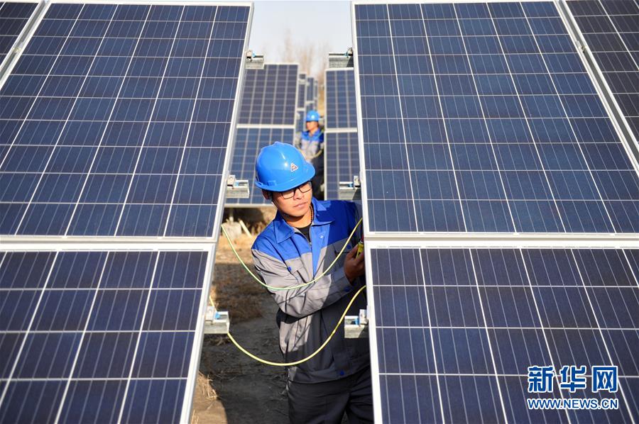 12月15日,工作人員在海興縣小山鄉(xiāng)常莊子村村級(jí)光伏扶貧電站內(nèi)進(jìn)行巡檢。