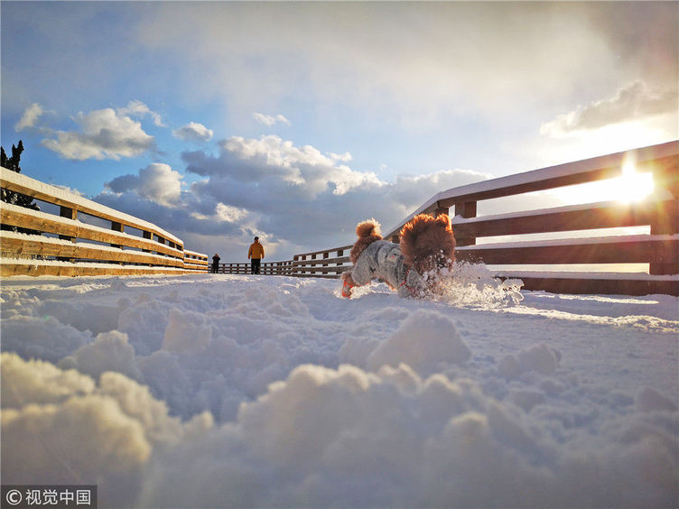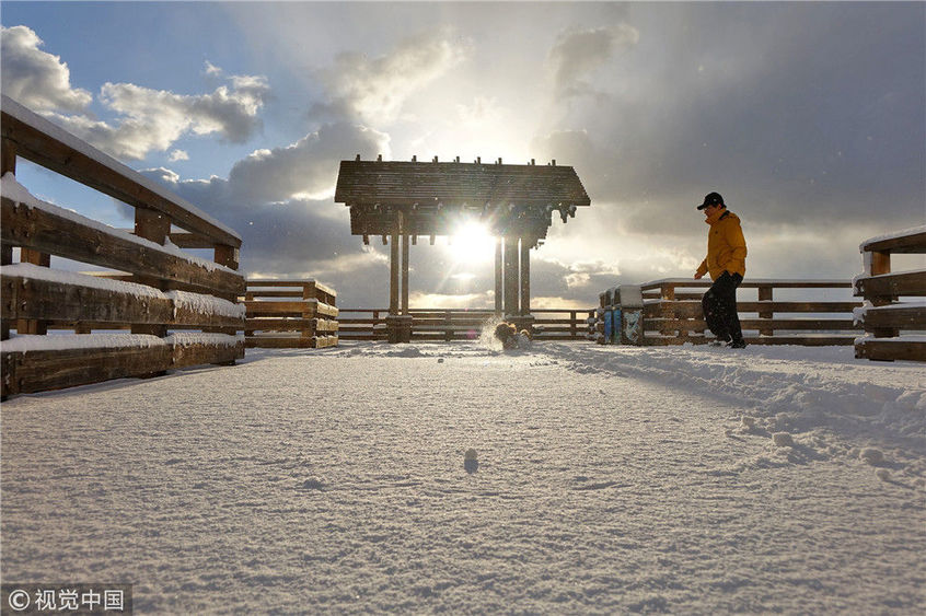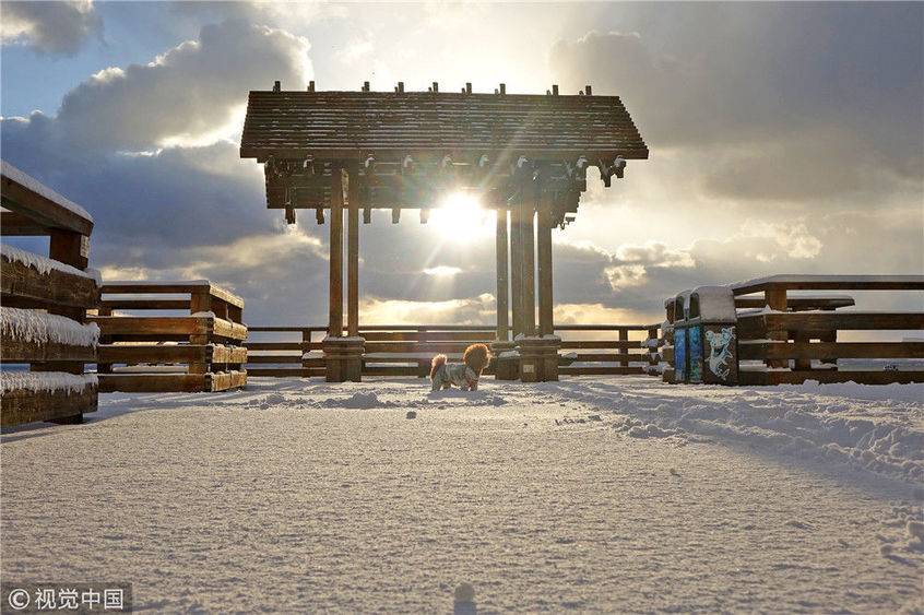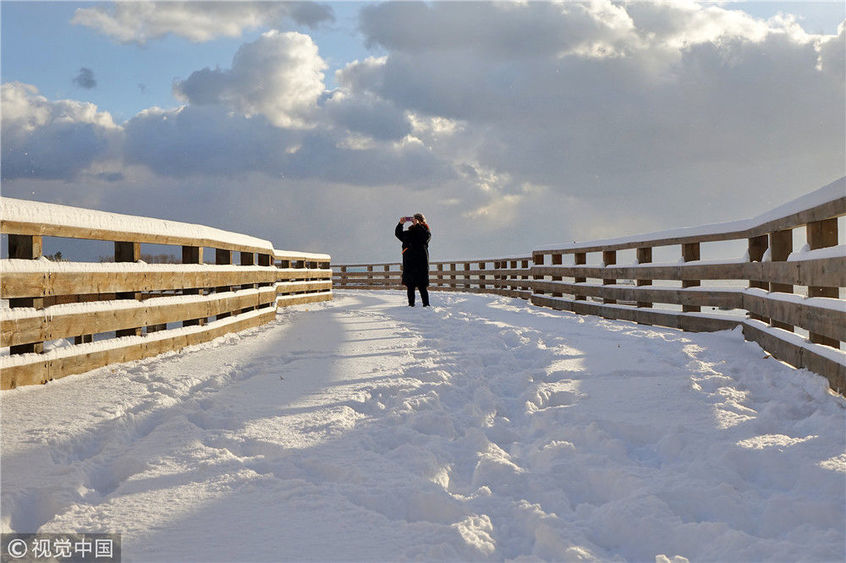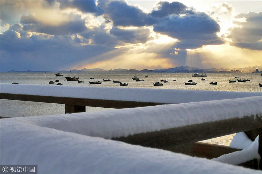 山東煙臺迎來初雪 獨(dú)特的海濱雪景美若童話