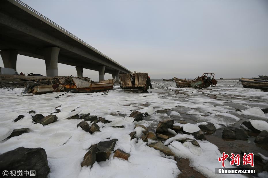 12月9日,受大風(fēng)降溫天氣影響,青島膠州灣北部冰情初現(xiàn),青島西海岸新區(qū)膠州灣跨海大橋入口處海冰層層疊疊,暫未對(duì)海上漁業(yè)生產(chǎn)帶來影響。張進(jìn)剛 攝 圖片來源:視覺中國(guó)