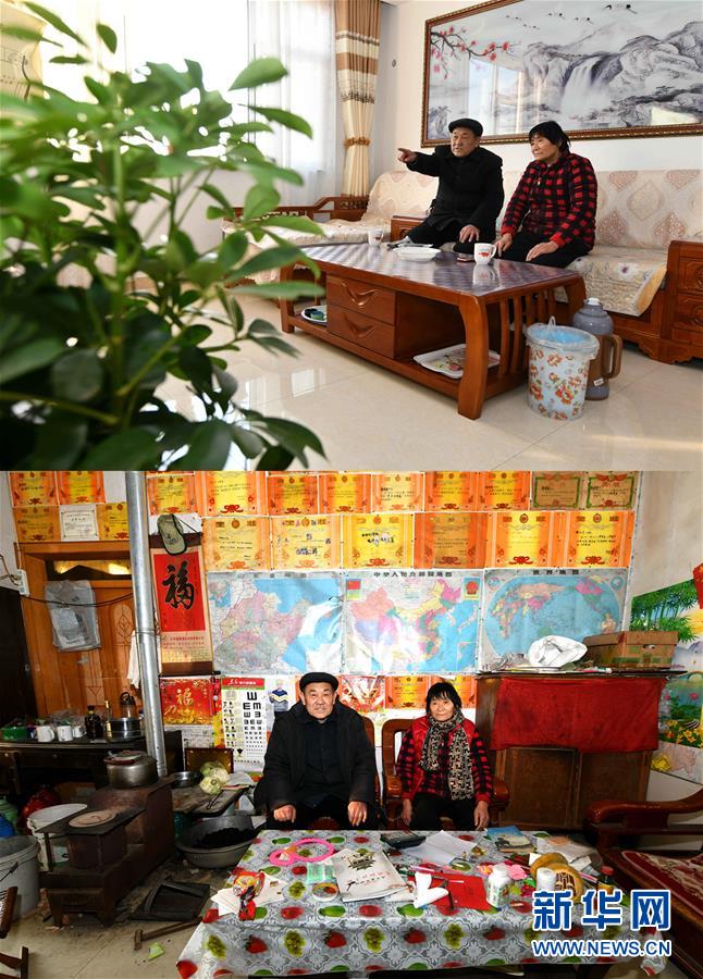 上圖為12月20日拍攝的青城鎮(zhèn)菜園村村民韓貽崗(左)和愛人在青平社區(qū)新居客廳內(nèi);下圖為12月20日拍攝的韓貽崗(左)和愛人在舊居客廳內(nèi)(拼版照片)。 新華社記者 朱崢攝