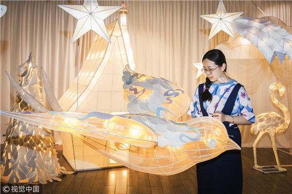 2018年5月6日,廣州,在天河區(qū)一家大商場(chǎng)辦個(gè)展時(shí),用紙片做成的北極熊、大松樹(shù)、火烈鳥(niǎo)、紙房子在光線的配合下美輪美奐,吸引了很多顧客駐足?!皫缀趺總€(gè)人一看到,都會(huì)走進(jìn)那個(gè)夢(mèng)幻的場(chǎng)景里,和這些紙雕一起合影?!眻D片攝于2018年5月6日。