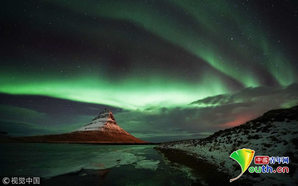 Kirkjufell山上空出現(xiàn)極光。圖片來源:視覺中國