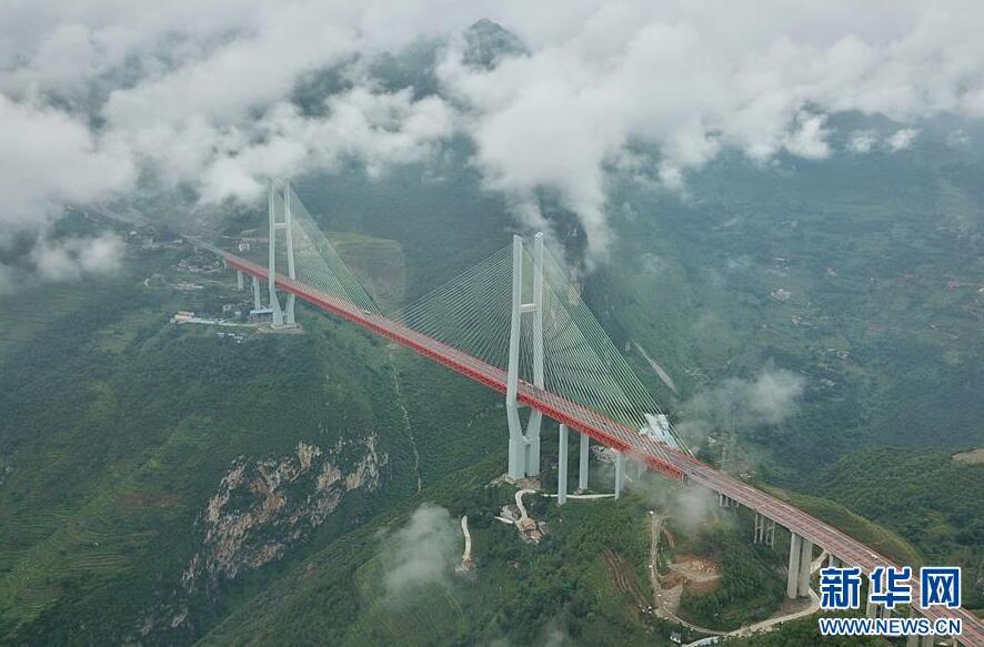 當(dāng)日,杭瑞高速貴州省畢節(jié)至都格(黔滇界)公路北盤(pán)江大橋上云霧繚繞,美景如畫(huà)。北盤(pán)江大橋主橋跨徑720米,橋面到谷底垂直高度565米。