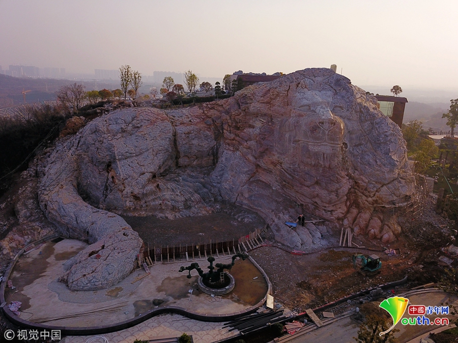 2018年12月23日,南京浦口區(qū)老山風(fēng)景區(qū)三河采石場(chǎng)宕口,利用宕口廢棄工地進(jìn)行生態(tài)修復(fù)的蜂巢酒店主體完工。經(jīng)過(guò)100名雕刻工人近半年的施工,酒店兩側(cè)被破壞的山體變成兩只高30多米的巨型山體雕塑石獅,栩栩如生,場(chǎng)面極其震撼。