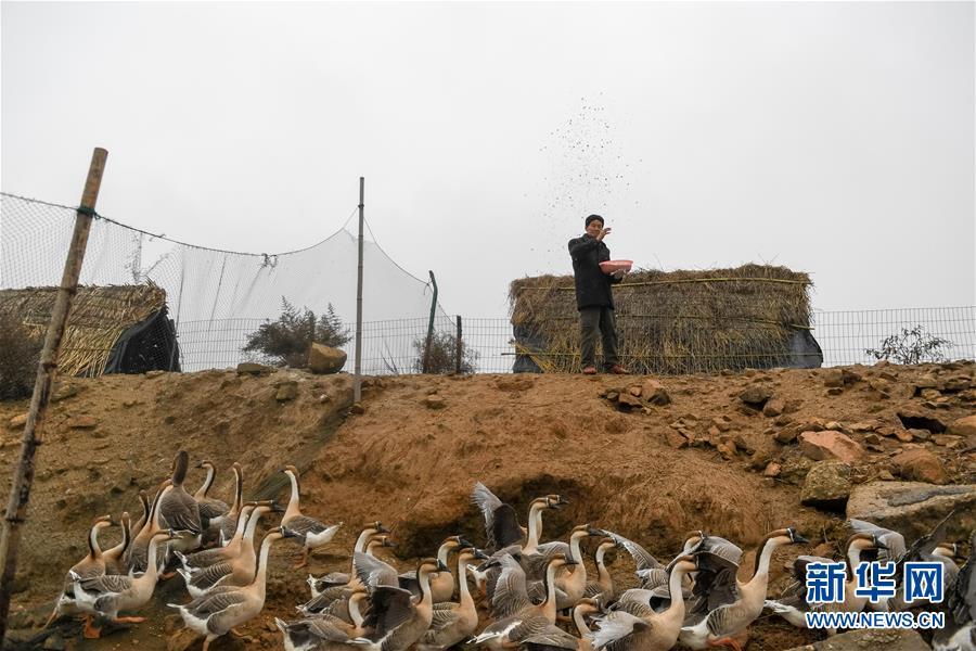 12月22日,王三益在給受傷的灰雁喂食,等到養(yǎng)好傷再將它們放飛。 新華社記者 張端 攝