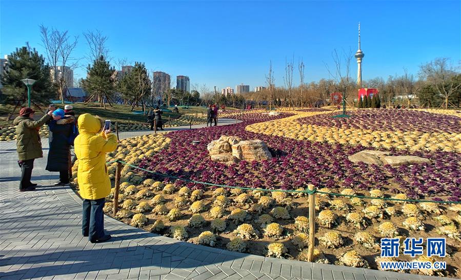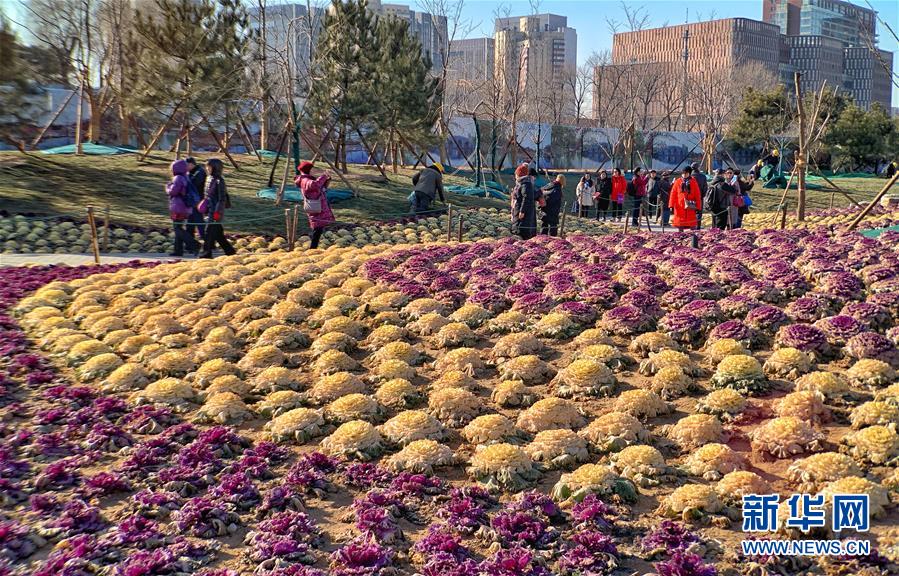 12月24日,游人在北京玉淵潭公園觀賞甘藍(lán)。 日前,北京市玉淵潭公園移栽的三萬多棵紫色和黃色羽衣甘藍(lán)盛開,為冬季公園增添了色彩。 新華社記者李欣攝