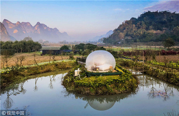 最近這幾年,中國的民宿風越刮越猛,各地精品民宿紛紛如雨后春筍一樣冒出了,而且他們用其更獨特的設計感吸引著人們的目光。其實對比星級酒店,民宿最大的優(yōu)勢,就是設計風格更獨特,更具藝術感,也更符合人們的審美要求,同時又能做到比星級酒店更舒適,更適合度假,所以大家現(xiàn)在出行都更熱衷于選擇民宿。圖為2018年12月18日,廣西桂林,陽朔縣遇龍河畔。晨光中的泡泡屋。棋簿紫/視覺中國