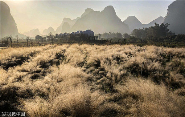 2018年12月18日,廣西桂林,陽朔縣遇龍河畔。晨光中的泡泡屋配套景觀——粉黛子。