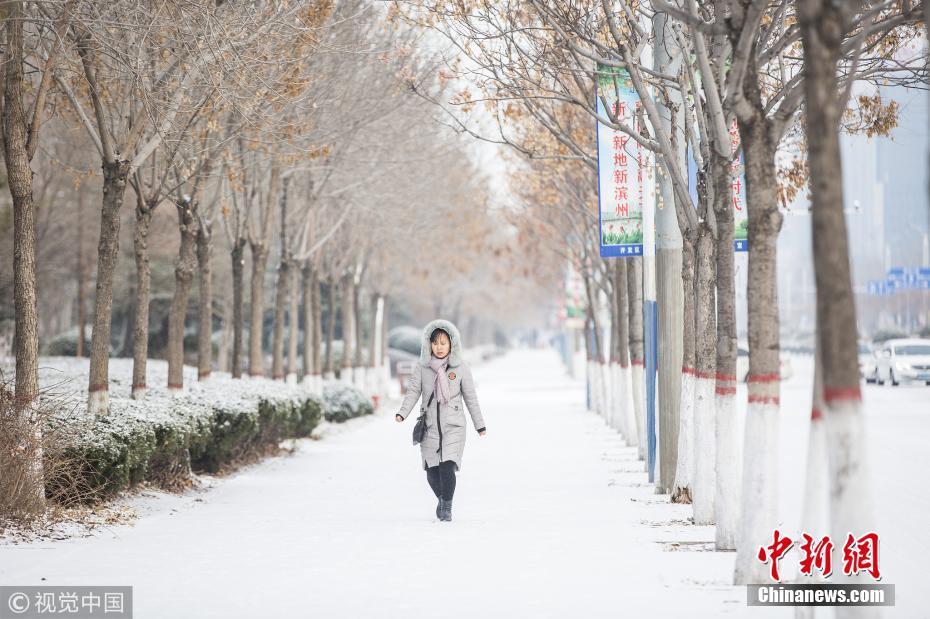 山東濱州發(fā)布道路結冰黃色預警信號市區(qū)出現(xiàn)較明顯降雪,路表溫度低于0℃。圖片來源:視覺中國