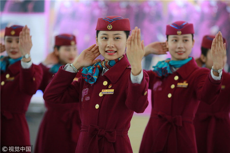 2018年12月27日,四川成都,為備戰(zhàn)即將開通的成雅鐵路,中國鐵路成都局集團(tuán)有限公司成都客運段動車二隊對成雅動車的乘務(wù)人員進(jìn)行理論、形體、服務(wù)禮儀等內(nèi)容的培訓(xùn)。
