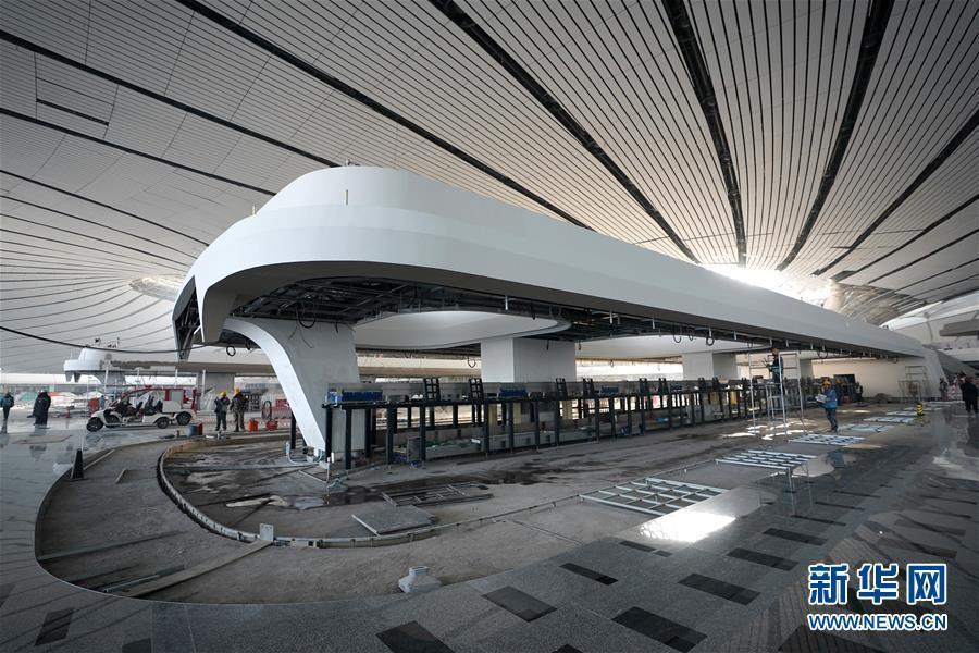 在北京大興國際機場主航站樓內(nèi),施工人員在進(jìn)行裝飾裝修工作。新華社記者 鞠煥宗 攝 圖片來源:新華網(wǎng)