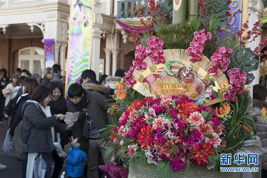 這是1月1日在日本東京迪士尼樂園拍攝的新年裝飾。 新華社記者杜瀟逸攝
