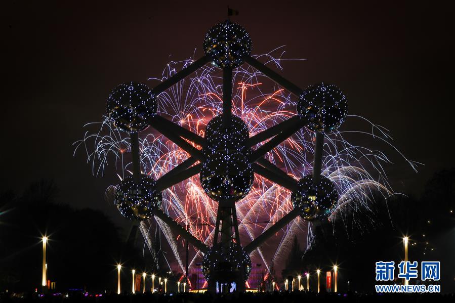 1月1日,比利時首都布魯塞爾的地標性建筑——原子球塔附近煙花綻放。 新華社記者鄭煥松攝