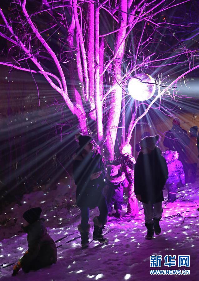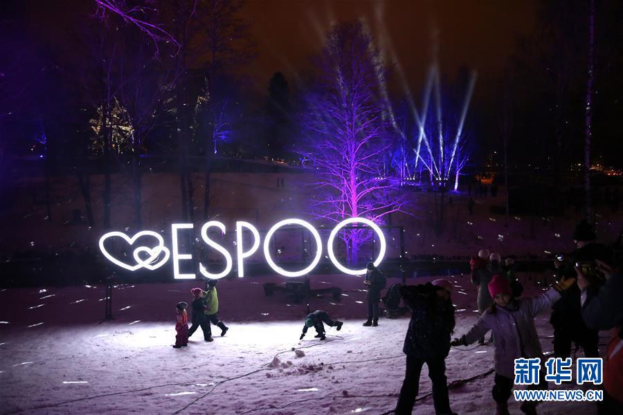 2018年12月31日,在芬蘭南部城市埃斯波,人們在燈光點綴的公園內(nèi)玩耍。