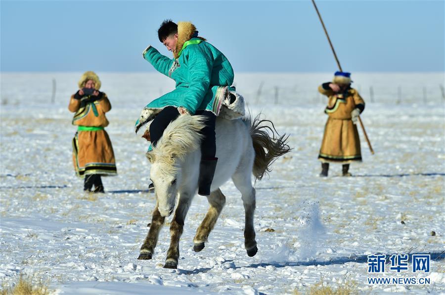 1月8日,牧民在馴服一匹烈馬。 時(shí)下正值草原冬季旅游旺季,內(nèi)蒙古自治區(qū)西烏珠穆沁旗的牧民們在雪原上一展身手,為游客展現(xiàn)獨(dú)特的民族風(fēng)情。 新華社記者 鄒予 攝
