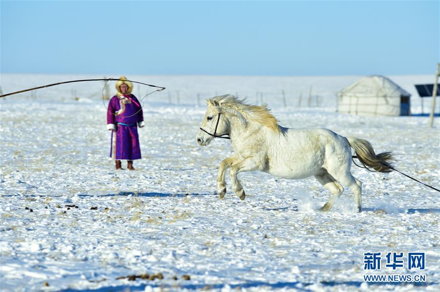 1月8日,牧民進(jìn)行套馬表演。 時(shí)下正值草原冬季旅游旺季,內(nèi)蒙古自治區(qū)西烏珠穆沁旗的牧民們?cè)谘┰弦徽股硎?,為游客展現(xiàn)獨(dú)特的民族風(fēng)情。 新華社記者 鄒予 攝
