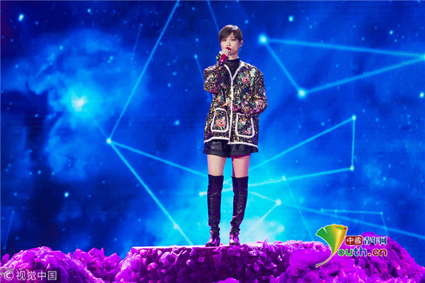 2019年1月8日晚,北京,李宇春亮相第17屆電影頻道電影百合獎頒獎典禮,并演唱了一首《你是如此難以忘記》。當晚的她一身閃花衣搭配黑色短褲長靴,一雙長腿吸睛十足,盡顯女人柔美和帥氣的雙重魅力,她手放胸前鞠躬向觀眾致意,謙遜有禮。