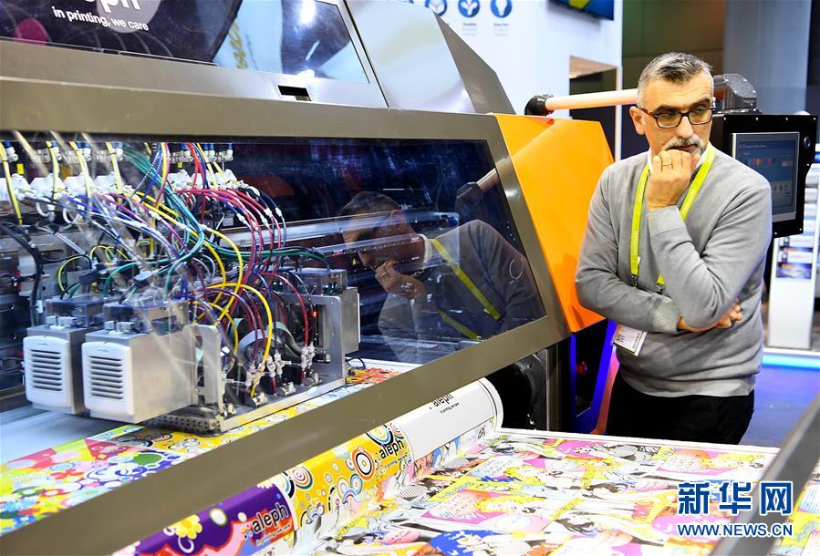 1月8日,在德國法蘭克福家紡展上,一名展商站在一臺(tái)紡織數(shù)碼印刷機(jī)旁。