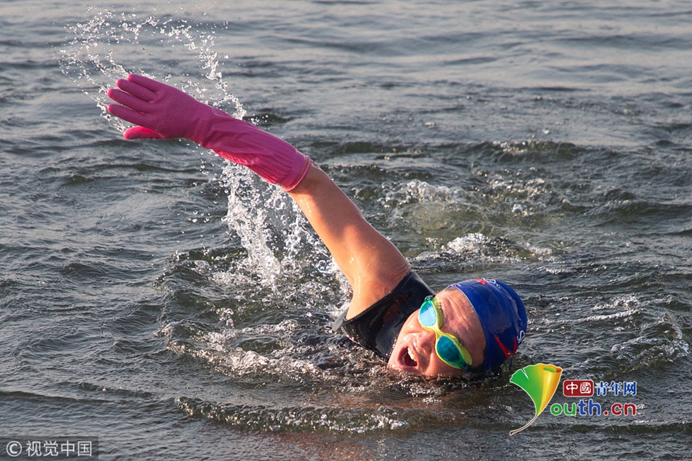 “我冬泳是從2002年開始的,當(dāng)時是看電視上播放哈爾濱的冬泳比賽,我心想人家可以,我也能,就這樣開始了冬泳?!闭麄€冬季,張敏石幾乎每天都會來南湖游泳區(qū)鍛煉。