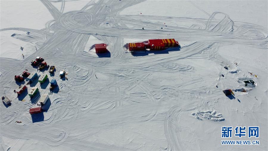 1月13日無(wú)人機(jī)拍攝的中國(guó)第35次南極科考隊(duì)昆侖隊(duì)營(yíng)地(左)、昆侖站(中)與深冰芯房。 新華社記者 劉詩(shī)平 攝