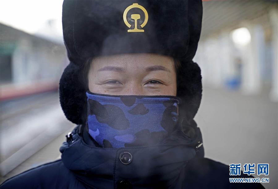 1月11日,在滿洲里火車站站臺(tái),由于氣溫近零下30攝氏度,“金鑰匙”服務(wù)臺(tái)客運(yùn)員“呵氣成霧”。