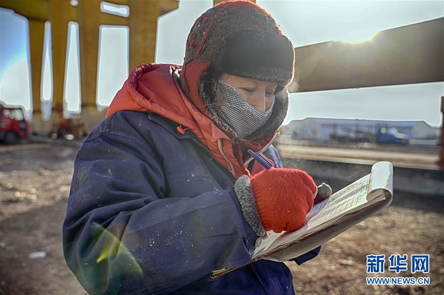 1月12日,在滿洲里鐵路口岸站裝卸二車間原木換裝場區(qū),工作人員對進口落地原木進行檢尺核對工作。 新華社記者 才揚 攝