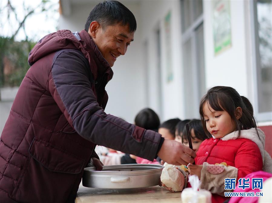 1月3日,燒完飯菜后,章站亮(左)給學(xué)校的學(xué)生們盛菜。 新華社記者 胡晨歡 攝