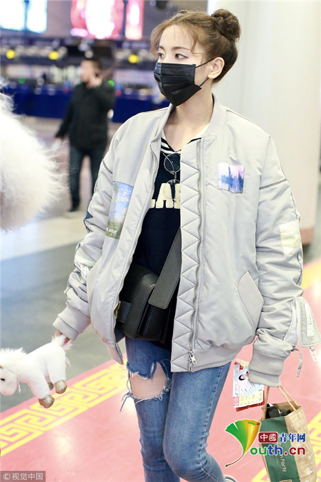 2019年1月14日,北京,楊超越現(xiàn)身機場。她扎哪吒頭活力十足,甩玩偶淘氣回眸,穿破洞褲露美腿,披面包服似自帶鼓風機。