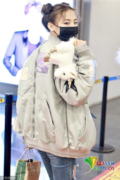 2019年1月14日,北京,楊超越現(xiàn)身機場。她扎哪吒頭活力十足,甩玩偶淘氣回眸,穿破洞褲露美腿,披面包服似自帶鼓風(fēng)機。