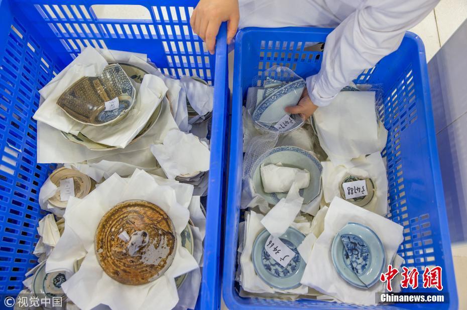 廣東省博物館文物保護(hù)科技中心出水文物保護(hù)實(shí)驗(yàn)室里,修復(fù)后的出水瓷器。譚慶駒 攝 圖片來源:視覺中國(guó)