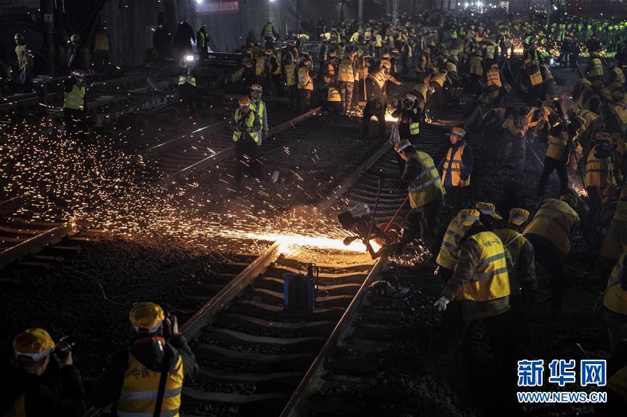 1月15日凌晨,中鐵十一局施工人員在西安站改現(xiàn)場緊張施工。新華社記者陶明攝