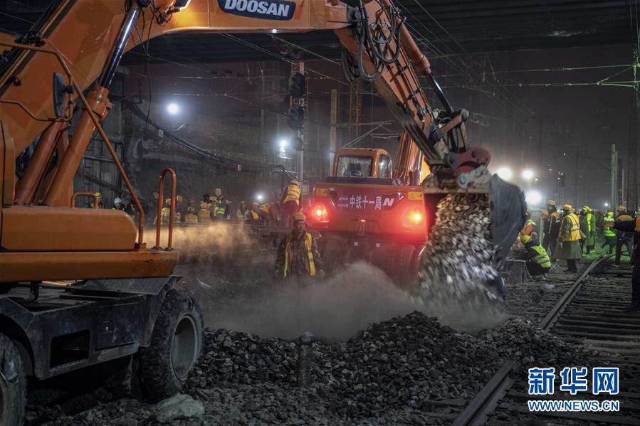 1月15日凌晨,中鐵十一局施工人員在西安站改現(xiàn)場緊張施工。新華社記者陶明攝
