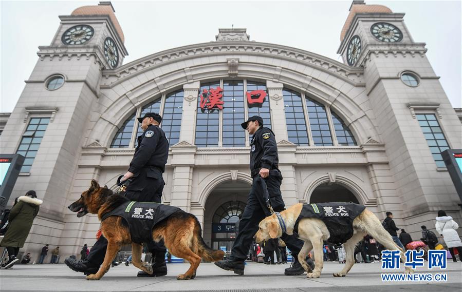 1月15日,訓(xùn)導(dǎo)員帶著警犬“皮特”(右)和“哼哼”在漢口火車(chē)站熟悉春運(yùn)執(zhí)勤場(chǎng)地。