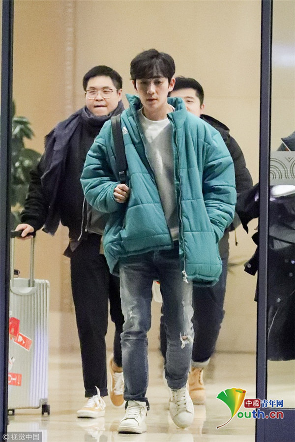 1月15日,北京,朱一龍現(xiàn)身機場。他穿綠色棉襖一路插兜保暖,搭配破洞褲潮范兒十足長腿搶鏡,打扮簡單毫無男神包袱,看鏡頭還一臉呆萌,但氣質(zhì)仍然出眾。