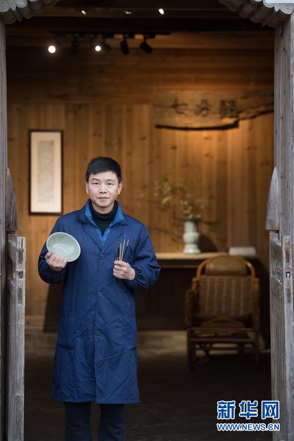 1月15日,吳榮強在龍泉市牛頭嶺村“七分醉”工作室前留影。 新華社記者翁忻旸攝