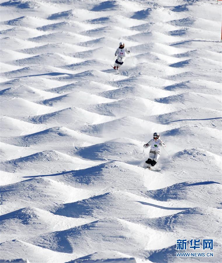這是運動員在張家口市崇禮區(qū)太舞滑雪場參加自由式滑雪雪上技巧世界杯比賽(2018年12月16日攝)。