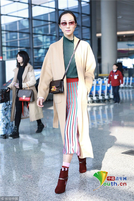 2019年1月17日,上海,韓雪現(xiàn)身機(jī)場(chǎng),穿著條紋紗裙露出小腿,十分抗凍,她搭配經(jīng)典的駝色大衣,氣質(zhì)出眾在機(jī)場(chǎng)人群中相當(dāng)搶鏡。