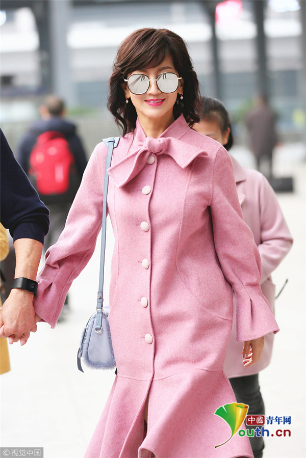 1月22日,廣東深圳,近日,趙雅芝與丈夫黃錦燊現(xiàn)身機(jī)場,黑超遮面的她身著粉色昵子魚尾大衣,氣質(zhì)超群,一路獲粉絲跟隨,共先生黃錦燊牽手同行。