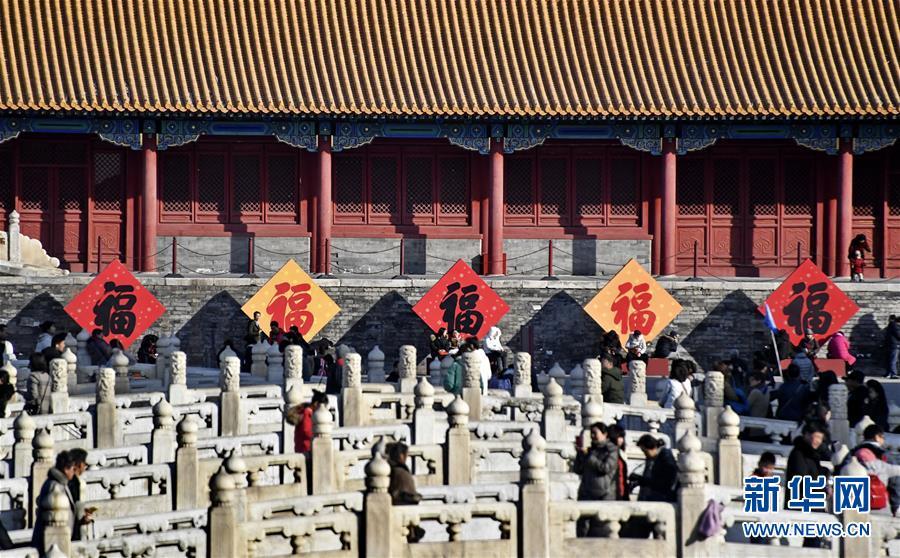 1月25日,游人在故宮內(nèi)的“五?!鼻傲粲啊?春節(jié)將至,北京故宮博物院內(nèi)張燈結(jié)彩,到處懸掛著宮燈、萬壽燈、年畫、門神、福字等古代宮廷節(jié)日裝飾品,讓來自國內(nèi)外的游人感受到濃濃的年味。 新華社記者 李欣攝