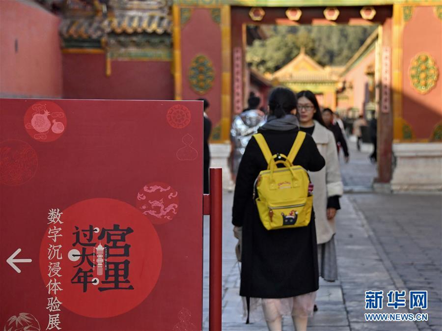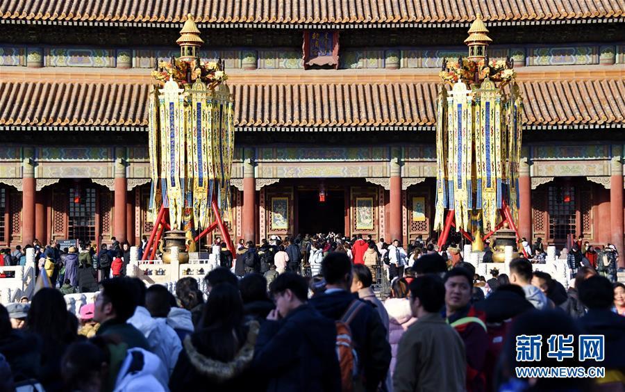 1月25日,游人在故宮內(nèi)參觀游覽。 春節(jié)將至,北京故宮博物院內(nèi)張燈結(jié)彩,到處懸掛著宮燈、萬壽燈、年畫、門神、福字等古代宮廷節(jié)日裝飾品,讓來自國內(nèi)外的游人感受到濃濃的年味。 新華社記者 李欣攝