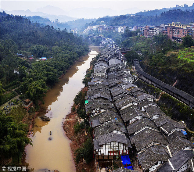2019年1月26日,重慶中山古鎮(zhèn),880桌“千米長(zhǎng)宴”5萬人共品年味。夜幕下的中山古鎮(zhèn),燈光璀璨,流水潺潺。
