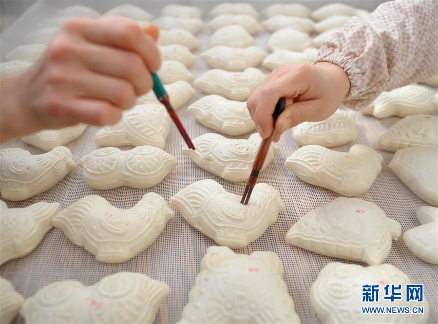 1月31日,河北省黃驊市一家面花作坊的工人給剛剛出籠的面花點上寓意吉祥喜慶的紅點。 河北黃驊市有著過年蒸面花的習(xí)俗。春節(jié)前夕,當(dāng)?shù)孛婊ㄖ谱鞴S加班加點制作面花,供應(yīng)春節(jié)市場。 新華社記者牟宇攝