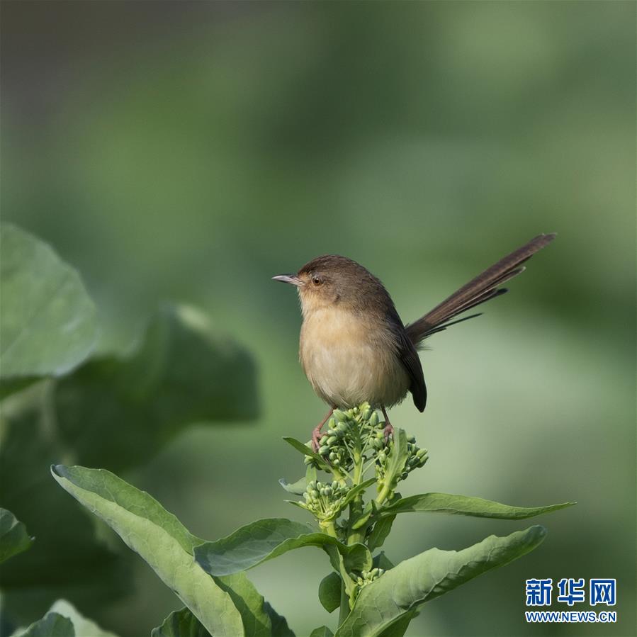 一只小鳥(niǎo)在油菜花枝頭上停歇(2月15日攝)。 新華社記者梅永存攝