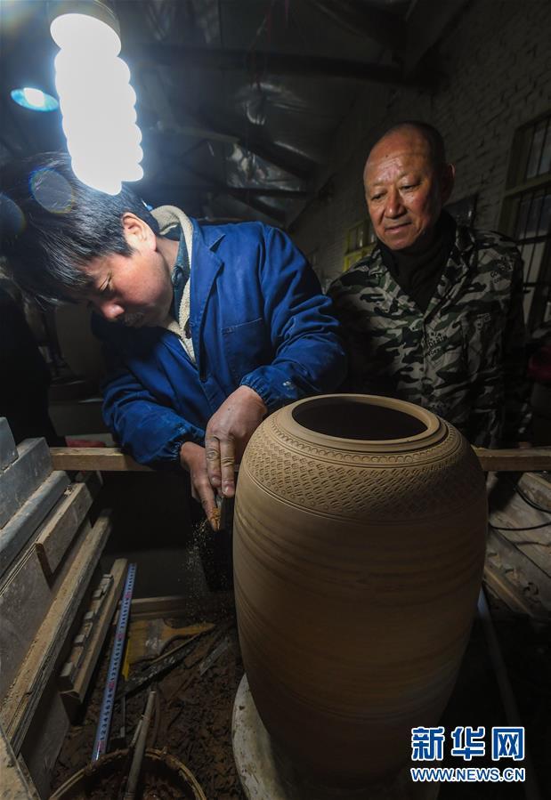 2月16日,陳新華(右)在指導(dǎo)徒弟修坯。新華社記者 徐昱 攝