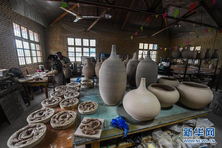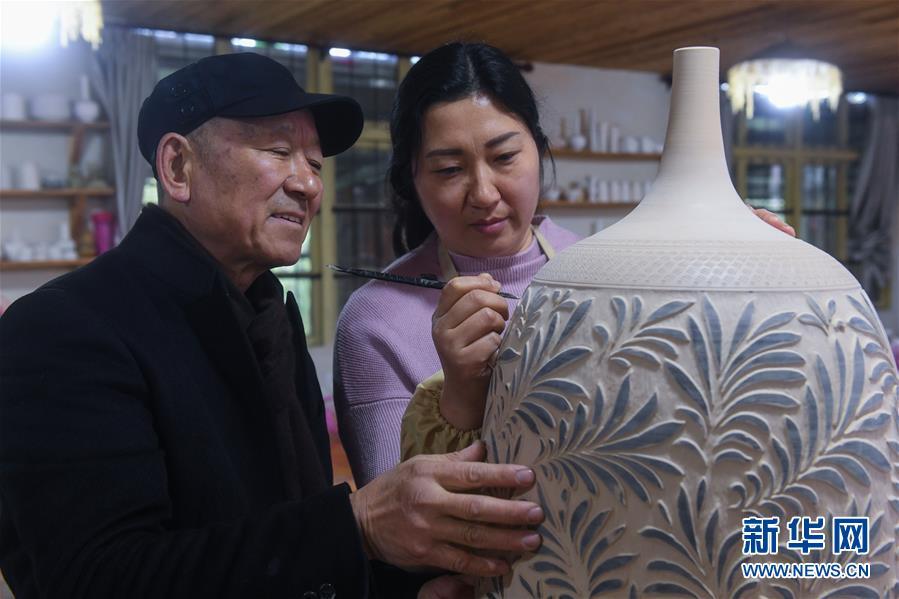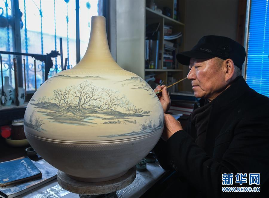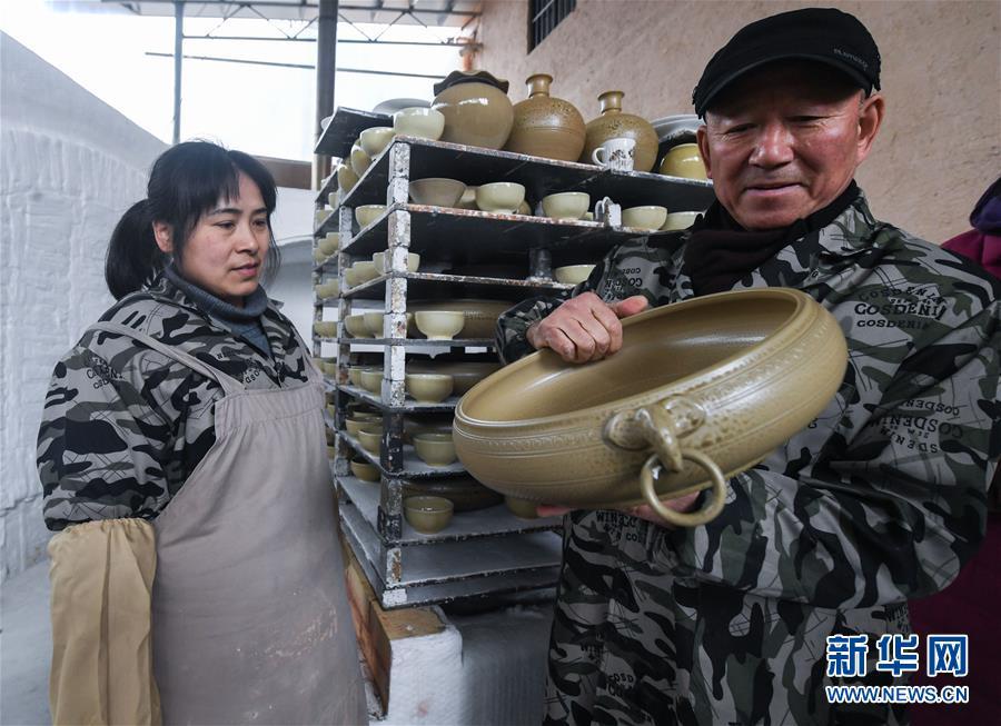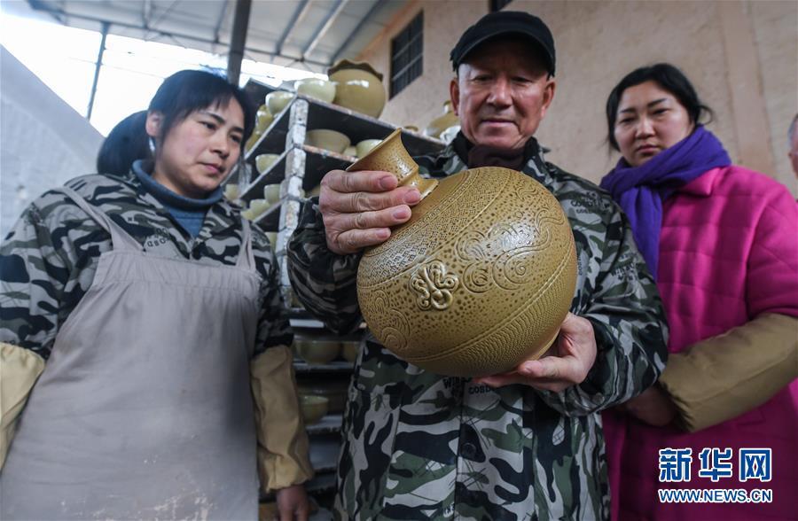 2月16日,陳新華在工作室中查看準(zhǔn)備進(jìn)行燒制的素坯。新華社記者 徐昱 攝