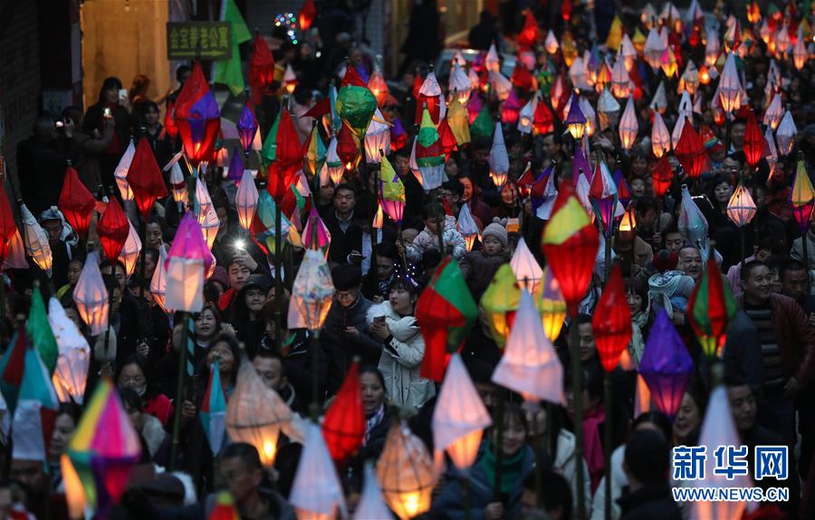 2月18日,在四川省南充市嘉陵區(qū)金寶鎮(zhèn),群眾舉著“蠐蟆燈”巡游。 當(dāng)日是農(nóng)歷正月十四,夜幕降臨后,川渝等地?cái)?shù)萬(wàn)名群眾在四川省南充市嘉陵區(qū)金寶鎮(zhèn)匯聚,點(diǎn)亮“蠐蟆燈”,敲著鑼鼓唱著歌謠,將“蠐蟆”送到幾公里外的田邊或者河邊燒掉,祈福健康平安。星星點(diǎn)點(diǎn)的燈光在鄉(xiāng)間小路閃爍移動(dòng),場(chǎng)面壯觀熱烈。 “送蠐蟆”祈福這一習(xí)俗源于清朝,歷經(jīng)演變成為川東北地區(qū)一個(gè)古老而神秘的地方民俗節(jié)日。 新華社記者 江宏景 攝