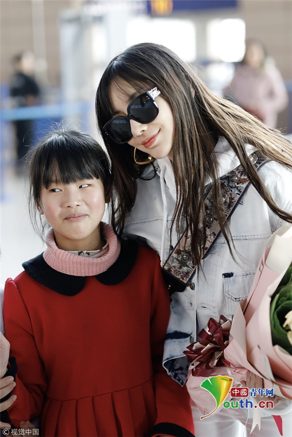 2019年2月24日,上海,楊穎現(xiàn)身機場。她全白套裝現(xiàn)身身材十分纖細(xì),手捧粉絲送的花與小粉絲合影,十分親切。