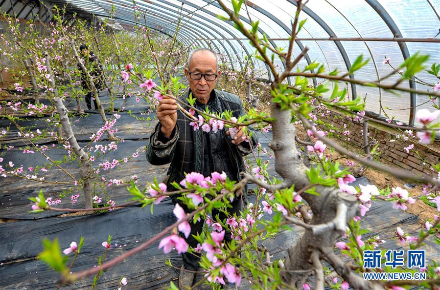 2月25日,果農(nóng)在邯鄲市邯山區(qū)碩果春農(nóng)業(yè)園大棚內(nèi)為桃花授粉。 隨著氣溫升高,河北省邯鄲市邯山區(qū)碩果春農(nóng)業(yè)園大棚內(nèi)的桃花競相綻放。 新華社記者 王曉 攝