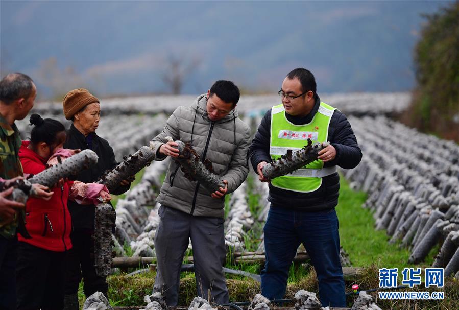 在廣西融水苗族自治縣大浪鎮(zhèn)上里村木耳種植基地,駐村第一書(shū)記楊崛(右一)和社員們?cè)诓榭茨径纳L(zhǎng)情況(2月28日攝)。