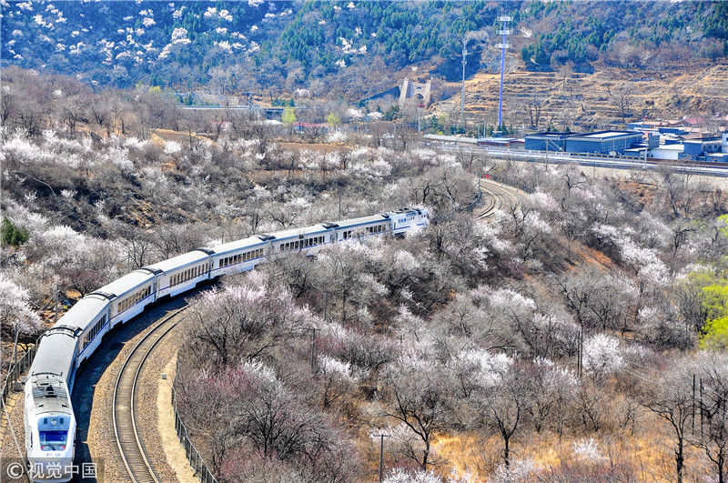 2019年3月22日,北京居庸關(guān)附近的山花盛開,S2線列車穿行在花海之中,構(gòu)成一幅美麗的畫面。
